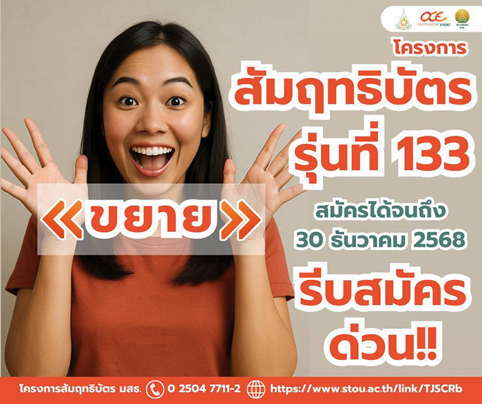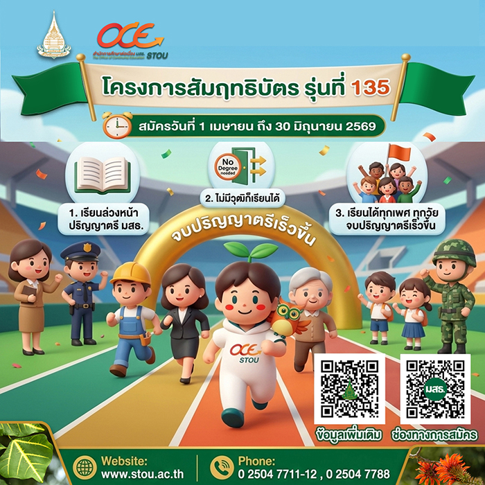 ติดต่อสอบถามข้อมูลเพิ่มเติม ฝ่ายบริการเผยแพร่ทางไกล สำนักการศึกษาต่อเนื่อง มหาวิทยาลัยสุโขทัยธรรมาธิราช 9/9 หมู่ 9 ถ.แจ้งวัฒนะ ต.บางพูด อ.ปากเกร็ด จ.นนทบุรี 11120 อีเมล์ : sumrit.oce@stou.ac.th โทรศัพท์ 0 2504 7711-12 โทรสาร 0 2503 3379