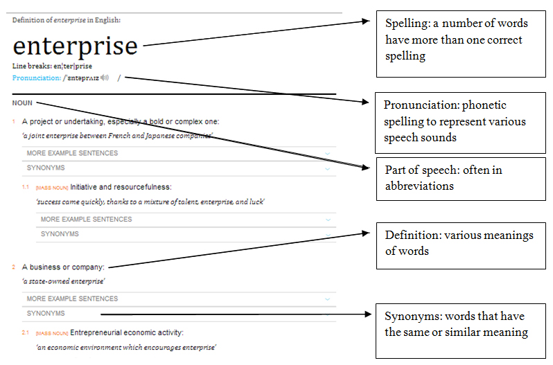The kinds and amount of information in a dictionary may vary. It is important to choose the dictionary that meets you particular needs.