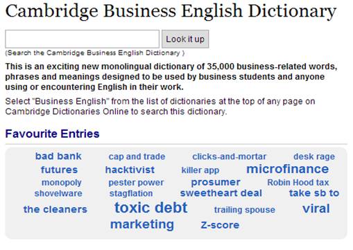 Cambridge Business Dictionary Online http://dictionary.cambridge.org/dictionary/business-english/ gives thousands of examples from real business texts, helpfully presented information about grammar, and there is a strong emphasis on collocation. Most of the words in the dictionary have a business subject label, such as Marketing, Finance, or Computing. These labels make words on a particular topic easy to identify and give you information about what aspect of business unfamiliar words belong to. In addition, you can hear the words spoken online with thousands of British English and American English recordings.