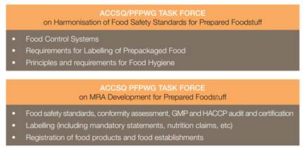 The main ASEAN bodies active in respect of harmonization and convergence of food safety and quality standards fall under the leadership of the ASEAN economics ministers. The ASEAN Consultative Committee on Standards and Quality (ACCSQ) is the key body responsible for coordinating work on standards and mutual recognition, accreditation and conformity assessment, and sector-specific harmonization efforts. There are two task forces that have been established to support the work of the ACCSQ: ACCSQ/PFPWG in respect of harmonization of food safety standards for prepared foodstuffs, and ACCSQ/PFPWG on MRA development for prepared foodstuffs. They cover the following topics:
