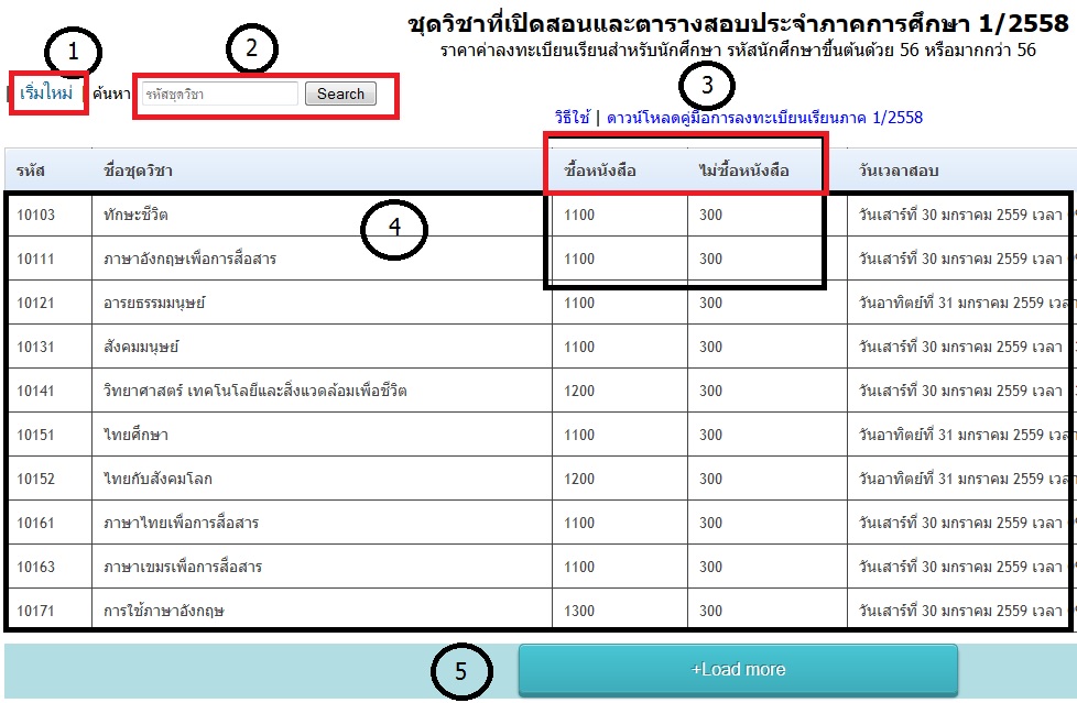 1) ปุ่ม "เริ่มใหม่" สำหรับ clear ข้อมูล แล้วกลับไปเลือกปีภาค หรือประเภทการลงทะเบียนใหม่ 2) กล่อง ค้นหาข้อมูลชุดวิชา ใช้สำหรับค้นหาข้อมูลชุดวิชาและตารางสอบ ควรค้นหาด้วยรหัสชุดวิชา 3) link สำหรับดาวน์โหลดคู่มือลงทะเบียน 4) พื้นที่แสดงข้อมูลชุดวิชา ราคา และตารางสอบ 5) ปุ่มดึงข้อมูลชุดวิชาเพิ่ม |