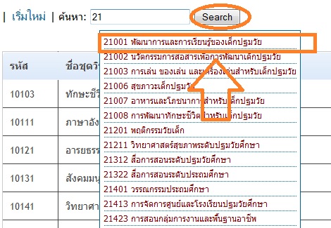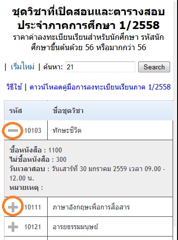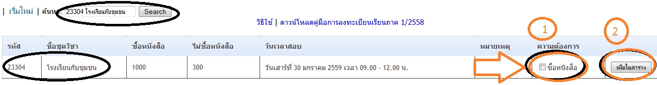 | เมื่อผลการค้นหาชุดวิชาปรากฏ ท่านสามารถนำชุดวิชานั้นๆ ไปคำนวณค่าลงทะเบียนเรียนได้ โดยการคลิกที่ปุ่มเพิ่มในตาราง แต่ก่อนจะคลิกปุ่มดังกล่าว ให้ท่านระบุความต้องการซื้อหนังสือหรือไม่ก่อน เพื่อจะได้ผลลัพท์ของอัตราค่าลงทะเบียนเรียนที่ถูกต้อง และหากต้องการเพิ่มชุดวิชาไปในตารางอีกให้ทำซ้ำ | |||