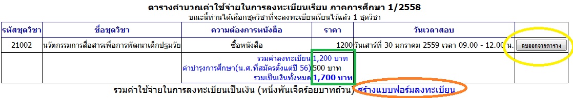 | ตารางคำนวณราคาค่าใช้จ่าย หากพบว่าชุดวิชาที่เลือกตารางสอบซนกัน ท่านสามารถลบชุดวิชาใดชุดวิชาหนึ่งออก แล้วเพิ่มเข้าไปให้ | |||