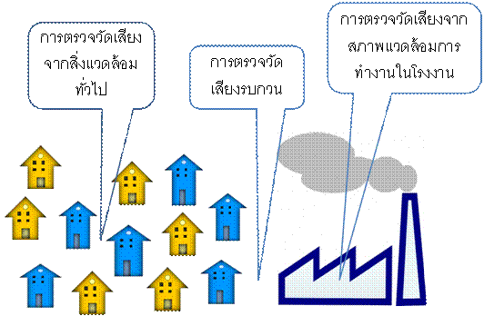 การตรวจวัดเสียงจากอุตสาหกรรม (2/2)โดย ผู้ช่วยศาสตราจารย์ปราโมช เชี่ยวชาญ สึบเนื่องจากจุลสารฉบับที่แล้ว ซึ่งได้ทบทวนความรู้ทั่วไปเกี่ยวกับเสียง ในฉบับนี้เป็นภาคต่อเนื่องจะกล่าวถึงกฏหมายประเทศไทยที่เกี่ยวข้องกับการตรวจวัดเสียงจากอุตสาหกรรมในภาพรวมพอสังเขป กฎหมายประเทศไทยที่เกี่ยวข้องกับการตรวจวัดเสียงจากโรงงานอุตสาหกรรม โดยทั่วไปการตรวจวัดเสียงในโรงงานอุตสาหกรรมมีการตรวจวัดเสียงหลายประเภทจากแหล่งต่างๆ หลายแหล่ง โดยมีวัตถุประสงค์ในการตรวจวัดและประเมินที่แตกต่างกันไป ในที่นี้จะขอกล่าวถึงเฉพาะการตรวจวัดเสียงที่เกี่ยวข้องกับโรงงานอุตสาหกรรมที่ประเทศไทยมีการกำหนดไว้เป็นกฎหมาย ดังแสดงในภาพที่ 1 พบว่า ในการตรวจวัดสียงโดยภาพรวมประกอบด้วยการตรวจวัดเสียง ดังนี้ ภาพที่ 1 การตรวจวัดเสียงที่เกี่ยวข้องกับโรงงานอุตสาหกรรม