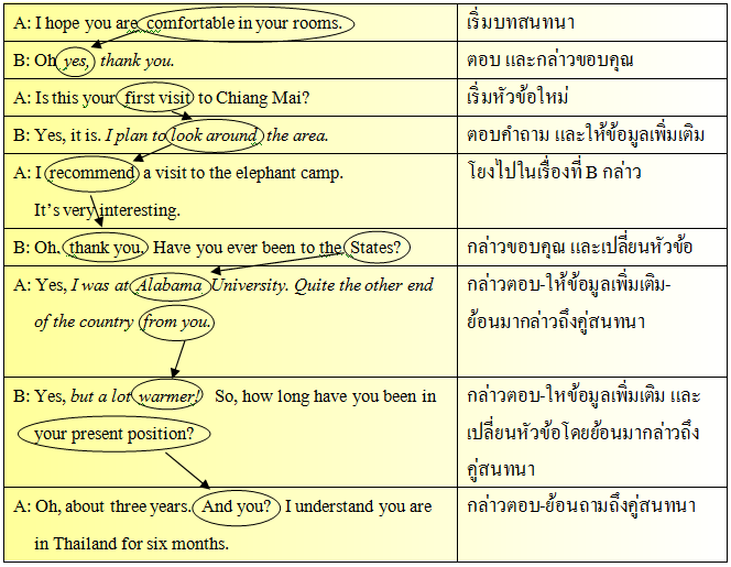 ในตารางตัวอักษรที่พิมพ์ตัวเอนแสดงข้อมูลที่ให้เพิ่มเติมจากการตอบคำถาม และจะเห็นได้ว่าบทสนทนาสามารถเชื่อมโยงจากข้อมูลที่ให้เพิ่มเติมนอกเหนือจากการตอบคำถาม และจากการย้อนถามข้อมูลของอีกฝ่ายหนึ่ง ดังนั้นในการสนทนาจึงไม่ควรเป็นไปในลักษณะ ที่ถามคำตอบคำ แต่ควรเสริมข้อมูลที่เกี่ยวเนื่องกับคำถามนั้น และควรถามข้อมูลจากคู่สนทนาบ้าง โดยอาจใช้สำนวน “And you?” หรือ “What about you?” เป็นต้น
