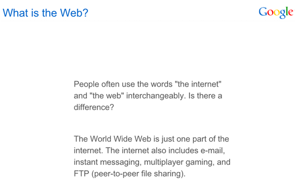 The internet is a global system of interconnected computer networks that allow people from all over the world to distribute, publish, share and exchange information. It is a network of networks that consists of millions of private, public, academic, business, and government networks, of local to global scope, that are linked by a broad array of electronic, wireless, and optical networking technologies. The internet carries an extensive range of information resources and services, such as the inter-linked hypertext documents and applications of the World Wide Web (WWW), the infrastructure to support email, and peer-to-peer networks for file sharing. Some common ways of connecting to the internet include: internet service provider (ISP), or simply turning on any computer, computer tablet or smart phone, which is on a network at work or school connected to the internet. Figure 1 gives basic definitions of terms widely used when searching the internet.