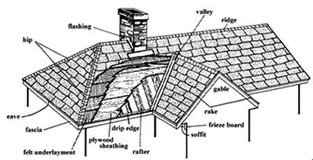 Tiled roofs typically have some of the features indicated above. This one shows a ‘gable end’ shown. The ‘rake’ is the angle of the roof, and the ‘ridge’ and ‘hips’ the names given to the two types of top roof joining parts. The ‘valley’ is the name given to an ‘inner’ roof joint. ‘Flashing’ is what is used to seal any added parts (a chimney in this case) to the roof to prevent leakage. ‘Drip edge’ is the overhanging part of the roof and ‘eave’ the space underneath. The inner linings of plywood and felt underlay are fixed to the (wooden) rafters. The ‘soffit’ is the space between the rafters and the outside wall to which the rafters are attached. Guttering and drainpipes would usually be attached to the fascia.