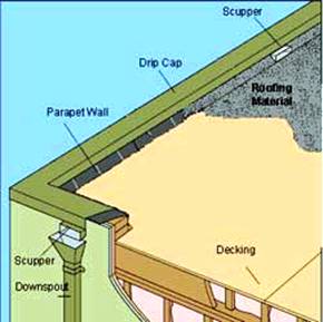 As suggested by many names in the picture the flat roof isn’t flat. It looks horizontal but has a slight slope to allow water drain off. The parapet is the raised part, which gives housing for the other parts and can protect from falling of when higher. Scuppers, drip caps and downspouts take away excess rainfall, and the decking will be the part of the roof between the top floors. The roofing materials used to cover the decking will usually be waterproof and extremely durable.