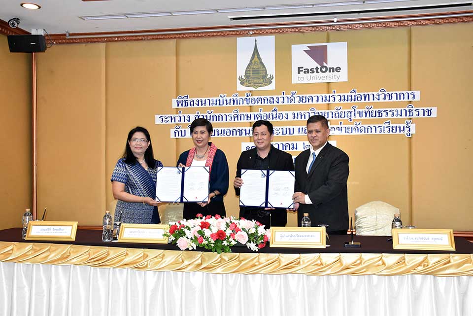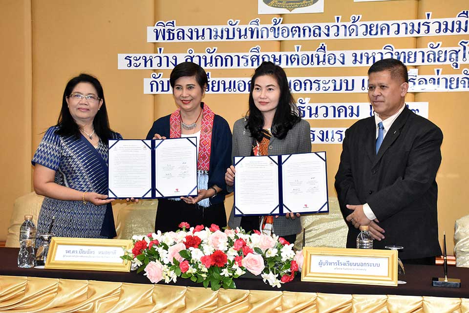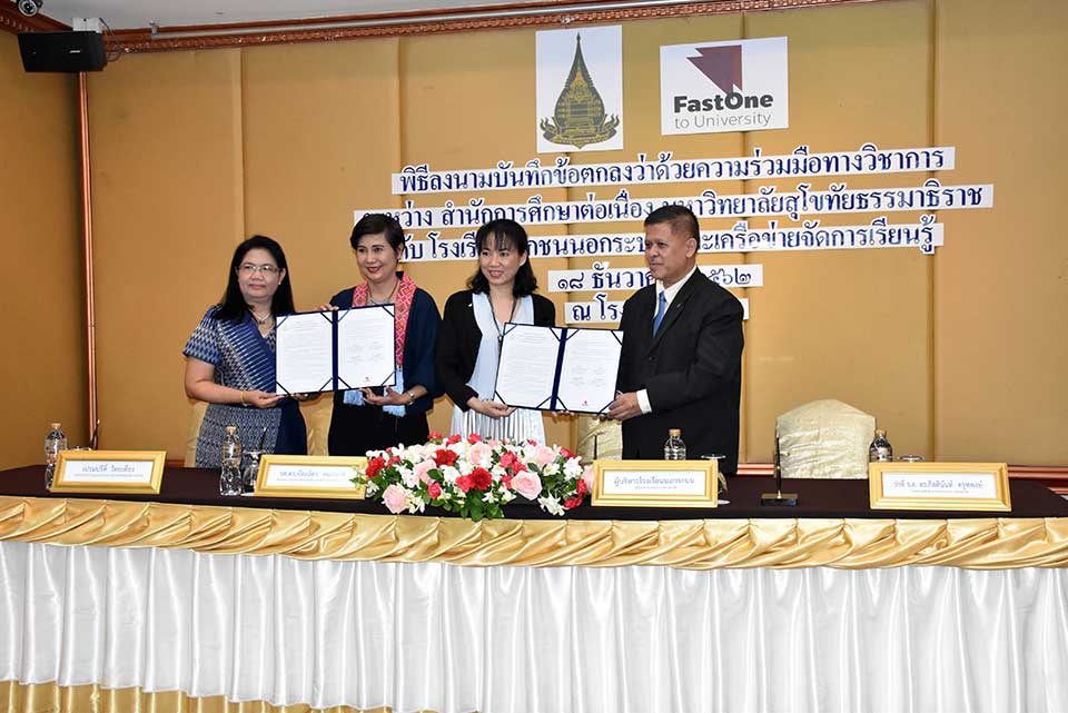 วันพุธที่ 18 ธันวาคม 2562 มหาวิทยาสุโขทัยธรรมาธิราช โดยรองศาสตราจารย์ ดร.ปัณฉัตร หมอยาดี ผู้อำนวยการสำนักการศึกษาต่อเนื่อง นางเปรมปรีดิ์ ไทยเที่ยง หัวหน้าฝ่ายบริการเผยแพร่ทางไกล มสธ.และว่าที่ร้อยตรี ดร.กิตตินันท์ ครุฑพงษ์ ที่ปรึกษาโรงเรียนบริหารธุรกิจไอ-เซิฟ โรงแรมตวันนา ร่วมลงนามในบันทึกข้อตกลงความร่วมมือ ทางวิชาการกับโรงเรียนเอกชนนอกระบบจากทั่วประเทศ 19 แห่ง เพื่อส่งเสริมการเรียนปริญญาตรีล่วงหน้าในหลักสูตรโครงการสัมฤทธิบัตรของมหาวิทยาลัยสุโขทัยธรรมาธิราช ณ ห้องประชุมสจ็วต โรงแรมตวันนา ถนนสุรวงศ์ บางรัก กรุงเทพฯ บันทึกข้อตกลงดังกล่าวมีขึ้นโดย ว่าที่ร้อยตรี ดร.กิตตินันท์ ครุฑพงษ์ ที่ปรึกษาโรงเรียนบริหารธุรกิจไอ-เซิฟ โรงแรมตวันนาซึ่งเป็นบัณฑิตระดับปริญญาโทและปริญญาตรี ของมหาวิทยาลัยสุโขทัยธรรมาธิราช (มสธ.) ได้เป็นผู้ส่งเสริมและสนับสนุนนักเรียนบริหารธุรกิจไอ-เซิฟ โรงแรมตวันนา ให้ได้ศึกษาหลักสูตรโครงการสัมฤทธิบัตรของ มสธ. ซึ่งใช้ระบบการศึกษาทางไกลเรียนควบคู่ไปกับการเรียนทั่วไปด้วย โดยเห็นว่านอกจากความรู้ที่ได้รับจากการเรียนแล้วยังสามารถได้รับวุฒิการศึกษาระดับปริญญาตรีจาก มสธ.ได้ ซึ่งผลการดำเนินงานของผู้เรียนในโรงเรียนช่วงเวลาที่ผ่านมาเกิดสัมฤทธิผลเป็นอย่างดียิ่ง จึงได้ขยายโอกาสทางการศึกษาแก่นักเรียนในโรงเรียนนอกระบบต่างๆ ที่เป็นเครือข่าย เพื่อเป็นประโยชน์และโอกาสของนักเรียนที่จะสำเร็จการศึกษาระดับอุดมศึกษาได้เร็วขึ้น มีโอกาสเลือกเรียนในสาขาวิชา อาชีพ ที่ตัวเองต้องการมากขึ้น ทั้งหมดจึงได้ร่วมมือกัน ดำเนินการภายใต้เครือข่าย FastOne to University ความร่วมมือ อนาคต และโอกาส โดยมี ว่าที่ร้อยตรี ดร.กิตตินันท์ ครุฑพงษ์ เป็นประธานเครือข่าย ทั้งนี้ทั้ง 19 โรงเรียน ที่ร่วมลงนามครั้งนี้ได้แก่ โรงเรียนกวดวิชา บี เอส พี , โรงเรียนกวดวิชาบ้านพีระมิด , โรงเรียนกวดวิชาปราชญ์ศึกษา , โรงเรียนกวดวิชาและภาษานพเก้า , โรงเรียนกวดวิชา ศุภลักษณ์ , โรงเรียนกิตติเทคโนโลยีสารสนเทศ , โรงเรียนคาเด็ทติวเตอร์ , โรงเรียนชนัดดาบริรักษ์ , โรงเรียนดนตรีนครปฐม , โรงเรียนตะวันออกคอมพิวเตอร์ , โรงเรียนเทคโน คอมหนองคาย , โรงเรียนบ้านวิชาการครูก้อย , โรงเรียนเปิดปัญญา , ศูนย์การเรียนรู้เพื่อการศึกษาภาษาอังกฤษลำปาง , สถาบันกวดวิชาญาณศรณ์ ,โรงเรียนสอนภาษาและ กวดวิชาเอ็น เค , โรงเรียนสอนภาษาอังกฤษราชสีห์ , โรงเรียนเสรีรักษ์การบริบาล และโรงเรียนแองเจิลแดนซ์ |